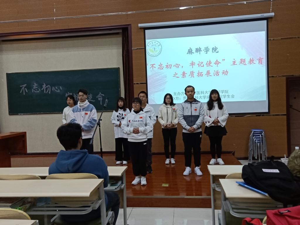 为丰富学生的课余生活,促进我院低年级同学沟通交流和团队协作能力。如意体育 于12月2日下午18:00南校区2101举行了"不忘初心,牢记使命"主题教育之素质拓展活动。如意体育 团委负责人徐青、辅导员陈燕秋、罗梦晗,如意体育 2018级、2019级全体同学共同参与。本次活动由2018级麻醉班李捷同学主持。