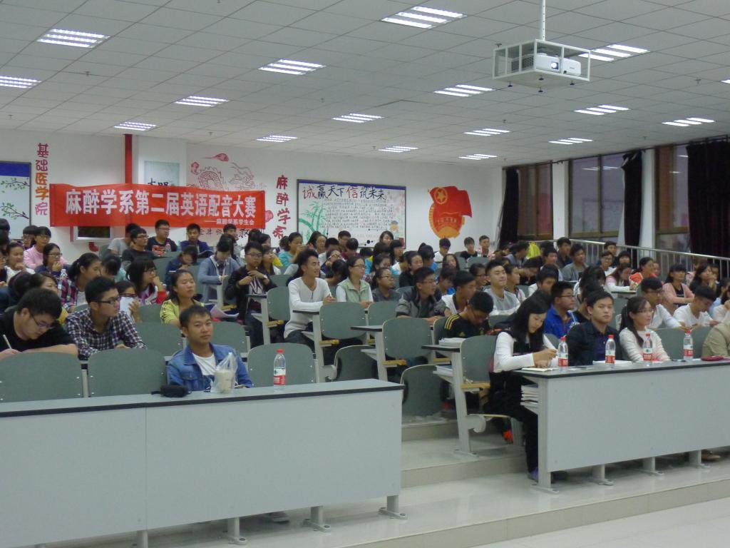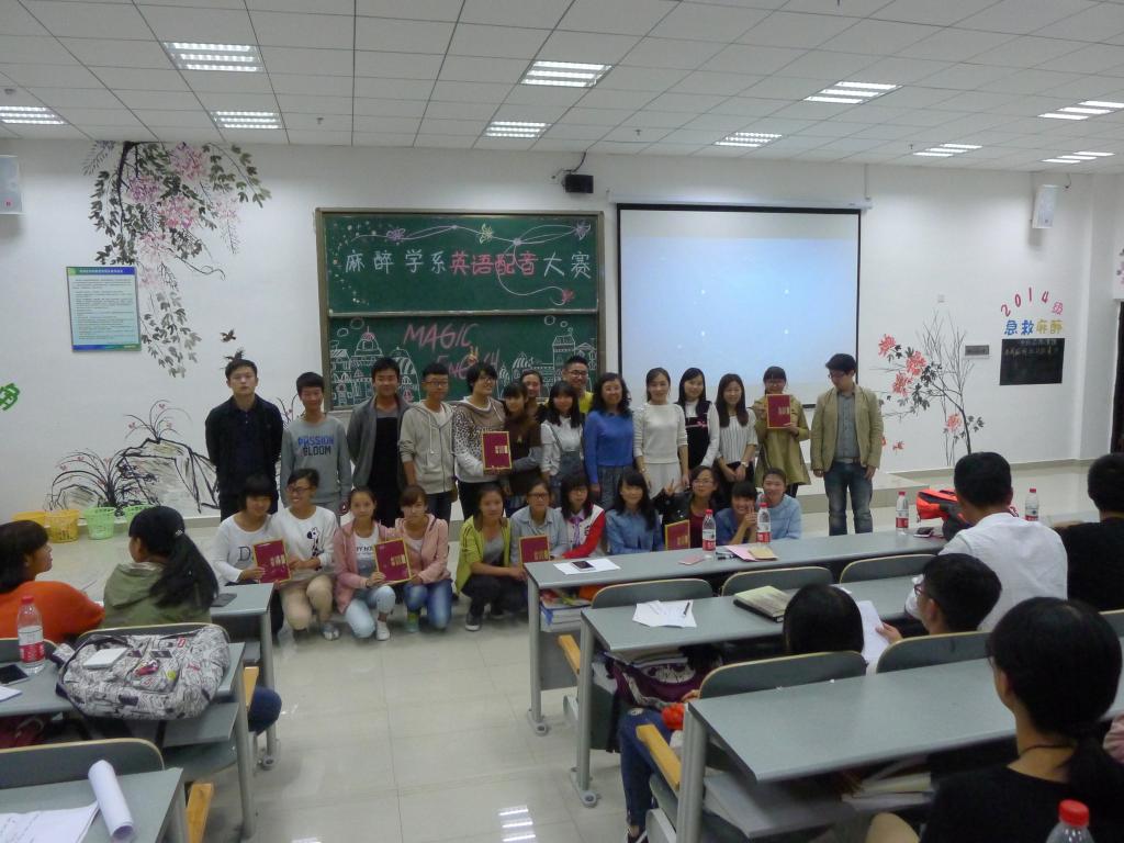 在全球一体化形势下,英语成为一门国际化语言,变得越来越重要。为了提高学生的英语口语能力,创设轻松愉悦的英语口语交流环境,麻醉学系于10月22日在7304教室举办了第二届英语配音比赛。比赛由2014级学生王小亚和杜诗群主持,到场评委嘉宾有:麻醉学系党总支书记刘建华,麻醉学系学生科科长何为、麻醉学系学生管理科副科长文钰纾、麻醉学系团总支副书记蔡炼,麻醉学系年级辅导员周霁、徐青。