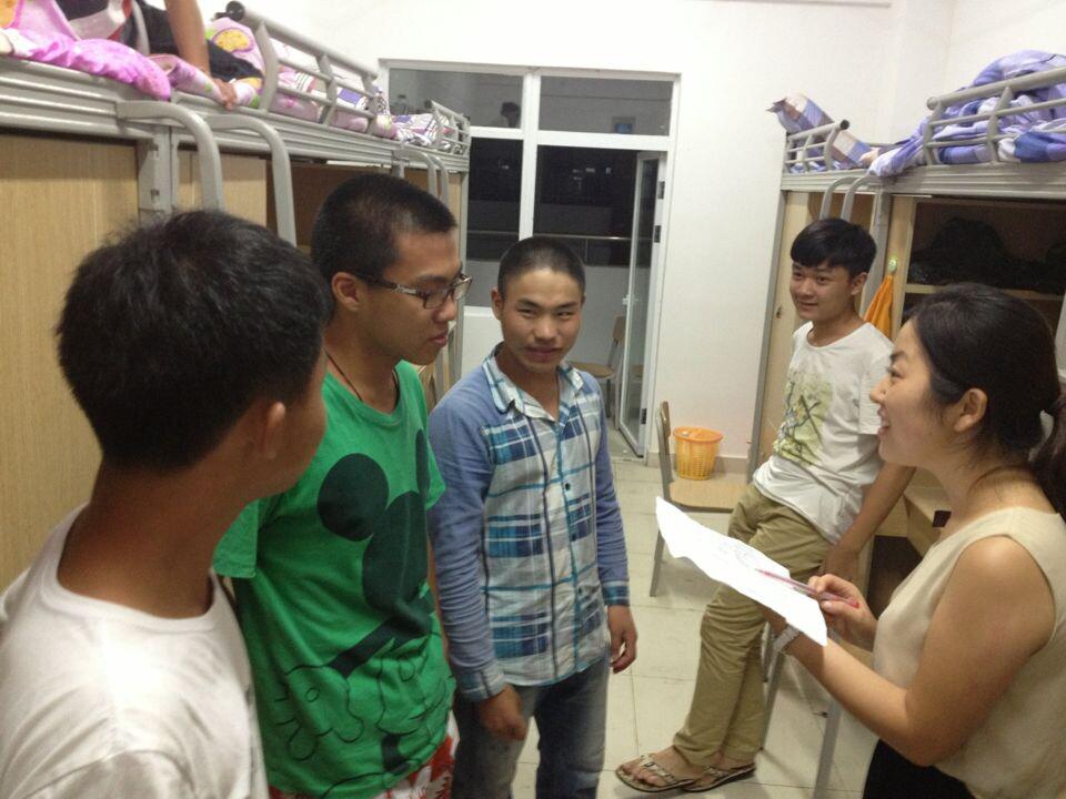 晚上7点整,辅导员老师周霁、徐青,带领部分班委来到新生宿舍,与同学们进行了愉快的交流,向新生介绍了学校的基本情况以及需要注意的相关事项等,即拉近了师生距离,又使新生感觉到家的温暖,感觉到学校的关怀,爱上学校!引导新生尽快融入大学新生活。