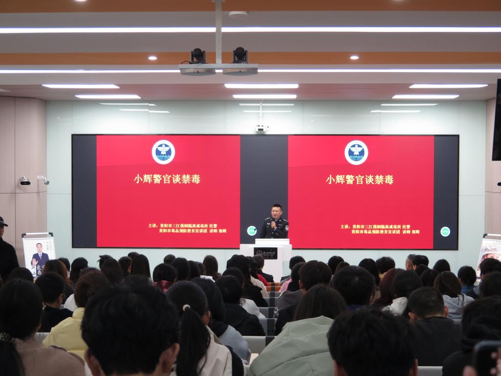 贵阳市三江强制隔离戒毒所民警郑辉作了详细的禁毒知识讲解,包括毒品种类、常见毒品的危害、毒品在社会中的传播途径等内容。并通过图表和案例,深入浅出地向学生们传达了禁毒知识,让他们真正意识到毒品对个人和社会的伤害。