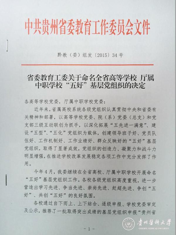 近日,省委教育工委下发了《关于命名全省高等学校厅属中职学校“五好”基层党组织的决定》(黔教(委)组发〔2015〕34号),命名表彰了一批全省高校“五好”基层党组织。我校医药卫生管理RYSPORTS