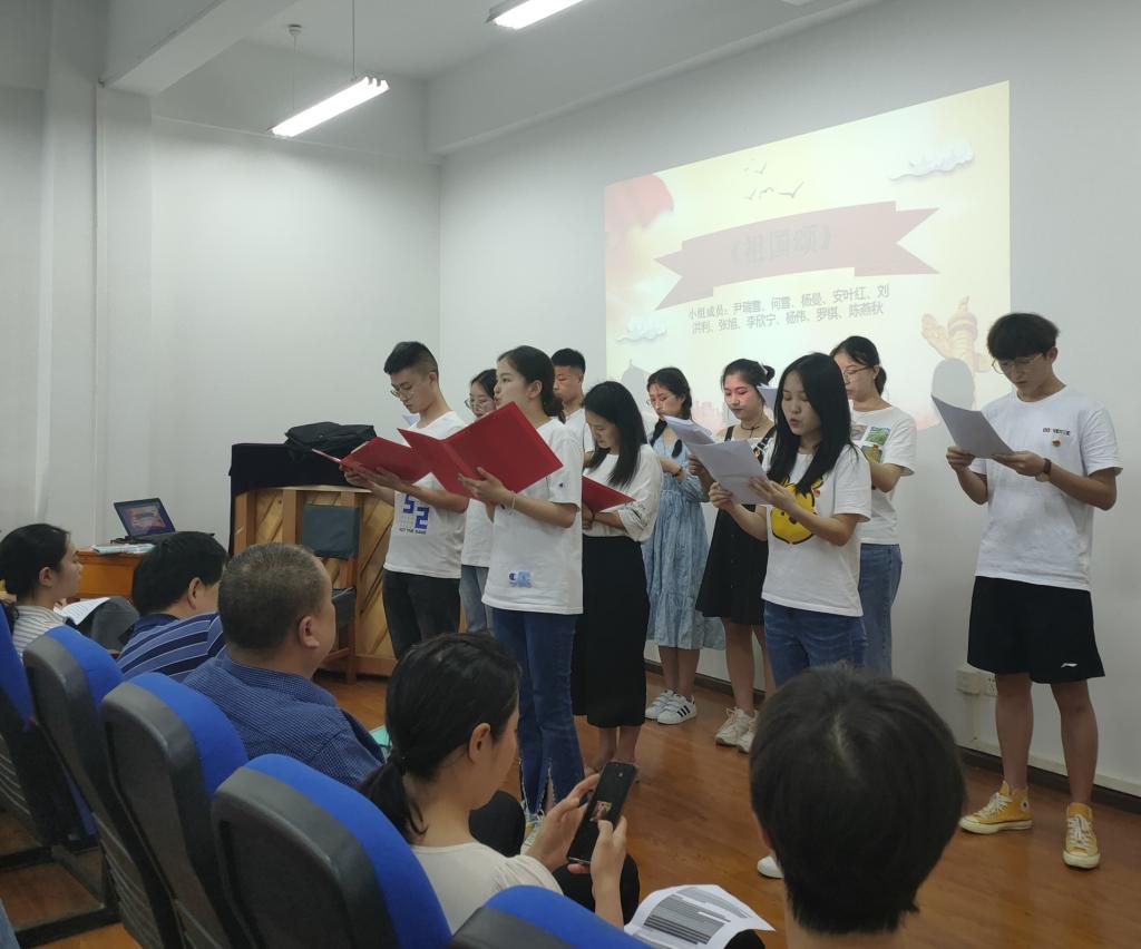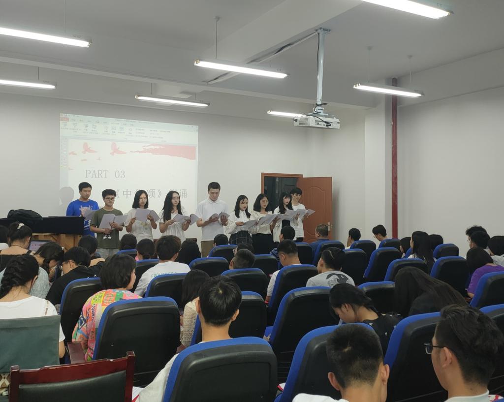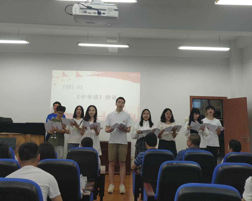 活动在学生党支部原创诗歌《初心》的朗诵中拉开序幕,《祖国颂》、《中华颂》讴歌了祖国的繁荣发展,谱写了中华民族发展史和人类发展史上华彩乐章的历程;《有一页历史》带领大家追忆党的峥嵘岁月,表达了对党的热烈拥护与爱戴;《细节的力量》(节选)、《中国共产党简史》(节选)展现了中国共产党在党和国家发展的重大历史关头带领中华民族砥砺前行,奋勇前进的拼搏姿态。