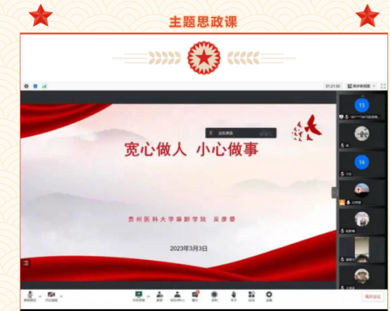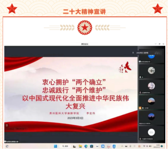 于3月3日中午,以线上形式开展党的二十大精神宣讲和以“宽心做人,小心做事”为主题的思政课。院党委书记李宏伟、党委副书记吴彦嫢、院正科级组织员刘蓉、教工党支部副书记徐青、学生党支部书记陈燕秋出席会议,2021级、2022级麻醉学专业全体同学以及学生党支部党员参加。会议由院党委副书记吴彦嫢主持。